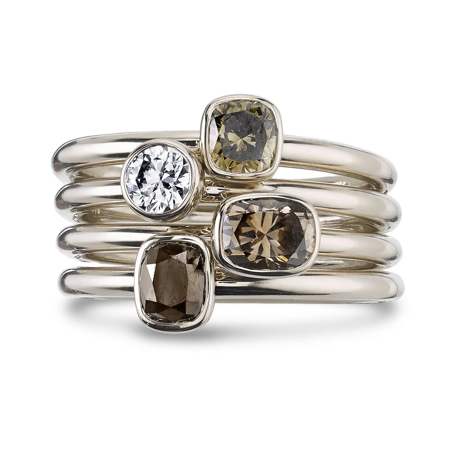 18k Natural White Gold rings with Green, Champagne, Cognac and White Diamonds
